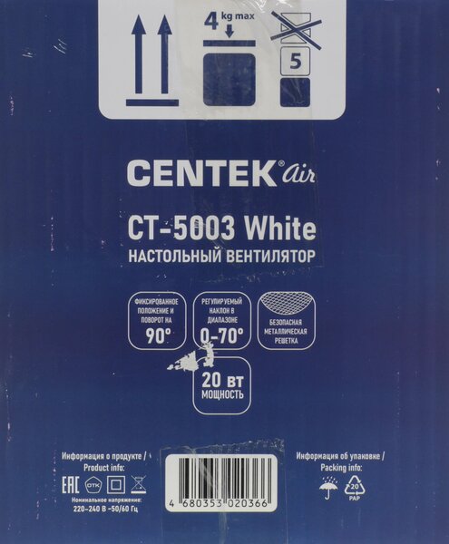 Вентилятор настольный Centek CT-5003 20Вт скоростей:2 синий/белый купить в интернет-магазине TPShop.Ru. Наличный и безналичный расчет, розничные и оптовые продажи. Самовывоз, доставка по Москве и МО, отправка во все регионы России.