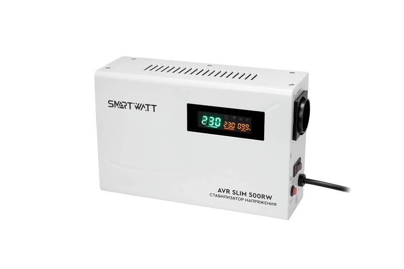 Стабилизатор напряжения Настенный, стабилизатор напряжения SMARTWATT AVR SLIM 500RW (100W - 260W, 500VA, 0.5 кВт, 50 Гц, розеток — 1, LED-дисплей, релейный, Настенный, 260x170x90мм, 2,53кг)