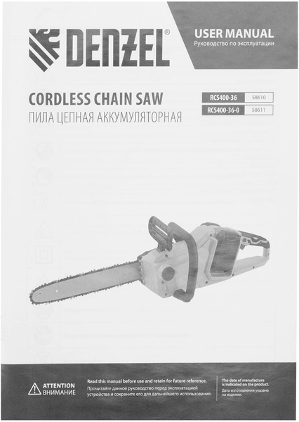 - Цепная пила аккумуляторная бесщеточная RCS400-36-0, Li-ion, 36 В, шина 400 мм Denzel