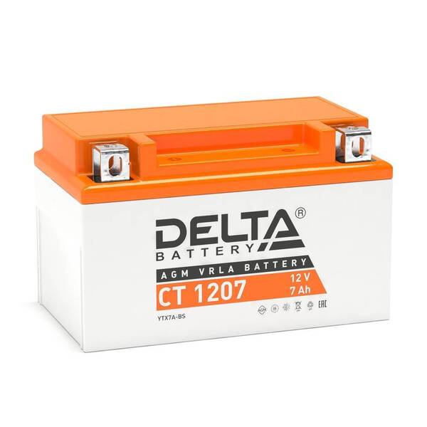 Аккумуляторная батарея Стартерный мото аккумулятор Delta CT 1207 напряжение 12В, емкость 7Ач, клемма Болт + гайка ? 6 мм (ДхШхВ: 150х86х94мм Полная высота 99мм; Вес 2,46кг; Кол-во элементов 6; Срок службы 5лет; Гарантия 1год)
