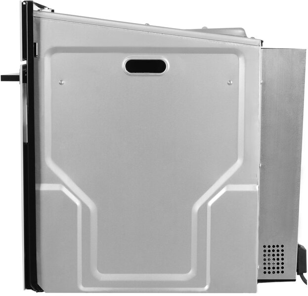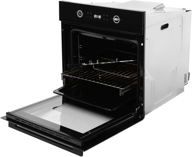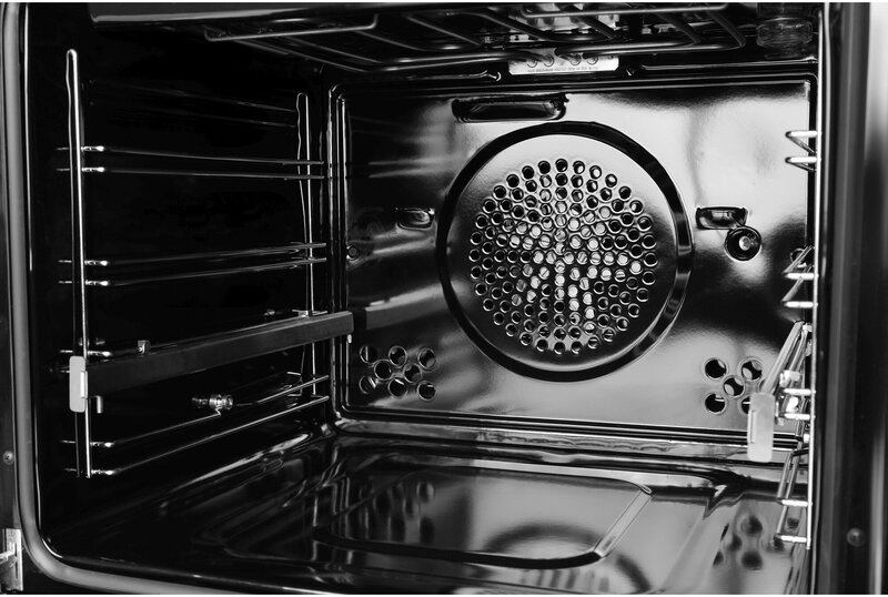 - вентилятор охлаждения, вертел, полностью стеклянная внутренняя поверхность дверцы духовки, телескопические направляющие