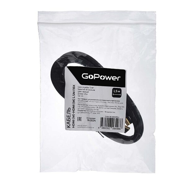 Кабель GoPower HDMI (m)-HDMI (m) 1.5м ПВХ ver.1.4 черный в пакете (1/150) купить в интернет-магазине TPShop.Ru. Наличный и безналичный расчет, розничные и оптовые продажи. Самовывоз, доставка по Москве и МО, отправка во все регионы России.