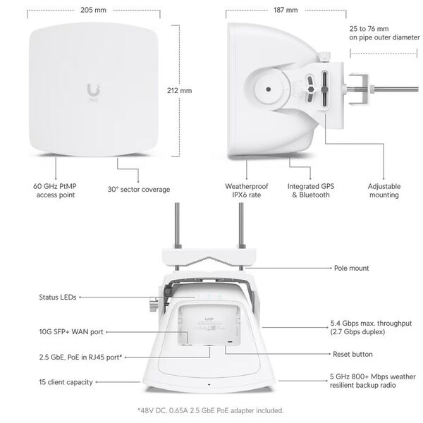- Базовая станция 60 ГГц т/доступа для PtMP до 5км (с Wave Nano)/до 8км (с Wave Pro/Long Range). Пропускная способность - 2.7Gbps. Резервный модуль 5ГГц(802.11ax/12dBi). Порт SFP+ 10G. IPx6
