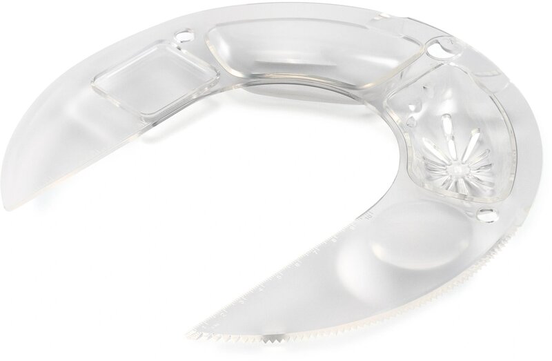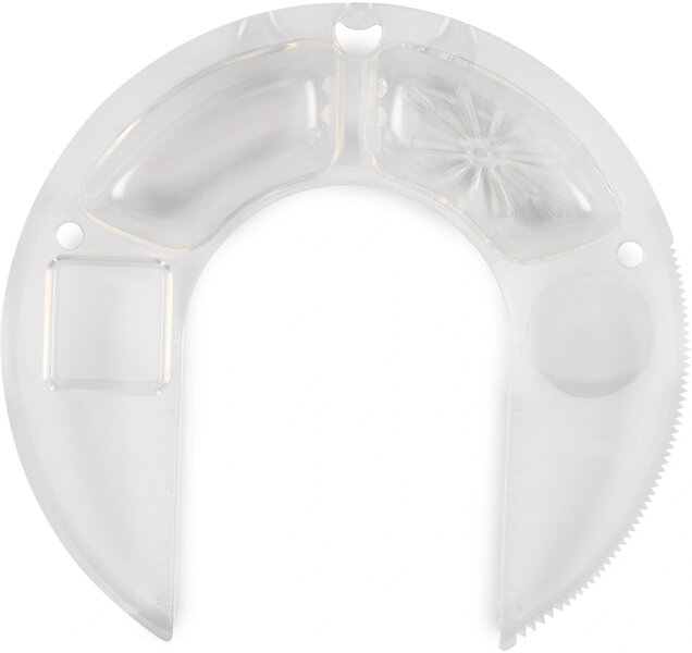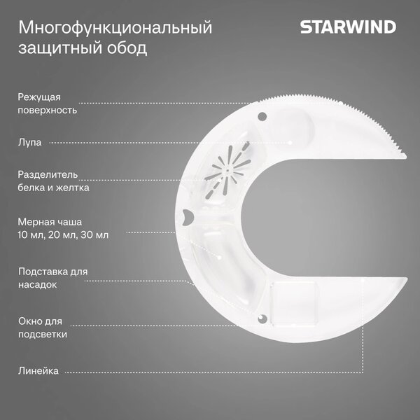 - Мультифункциональный обод: режущая поверхность + разделитель белка и желтка + ёмкость для добавления ингредиентов + отверстие для хранения насадок + подставка под фонарик + линейка