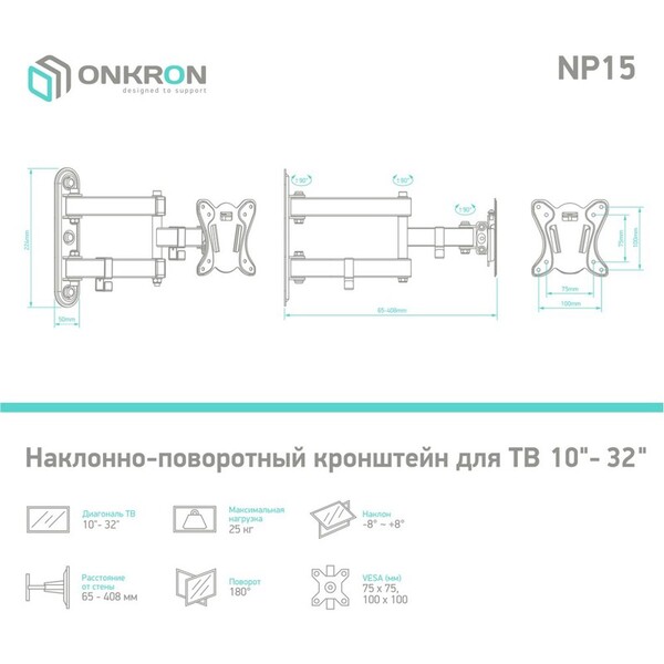 Кронштейн ONKRON/ 10-32'' макс 100*100 мм, 2 колена, наклон -+ 8?, поворот: 180°, от стены 65-408 мм, макс вес 25кг, черный купить в интернет-магазине TPShop.Ru. Наличный и безналичный расчет, розничные и оптовые продажи. Самовывоз, доставка по Москве и МО, отправка во все регионы России.