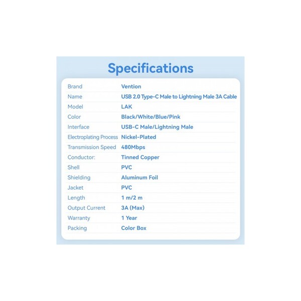 Кабель Vention USB 2.0 CM/Lightning 8M для iPad/iPhone 3A - 1м. Голубой купить в интернет-магазине TPShop.Ru. Наличный и безналичный расчет, розничные и оптовые продажи. Самовывоз, доставка по Москве и МО, отправка во все регионы России.