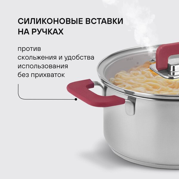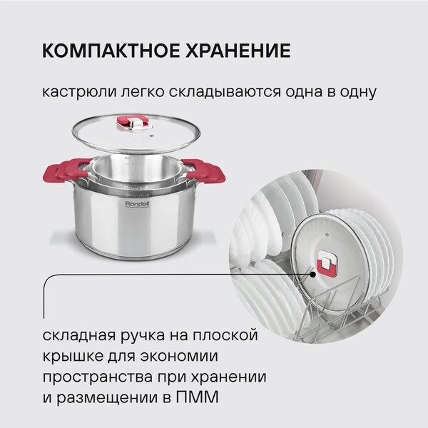 - Материал: силикон; нержавеющая сталь 18/10. Внутреннее покрытие: SilkWare® (для сковороды и сотейника). Преимущества: складная ручка на плоской крышке; силиконовые вставки на ручках против скольжения; отверстие для выпуска пара; компактное хранение: кастрюли легко складываются одна в одну.