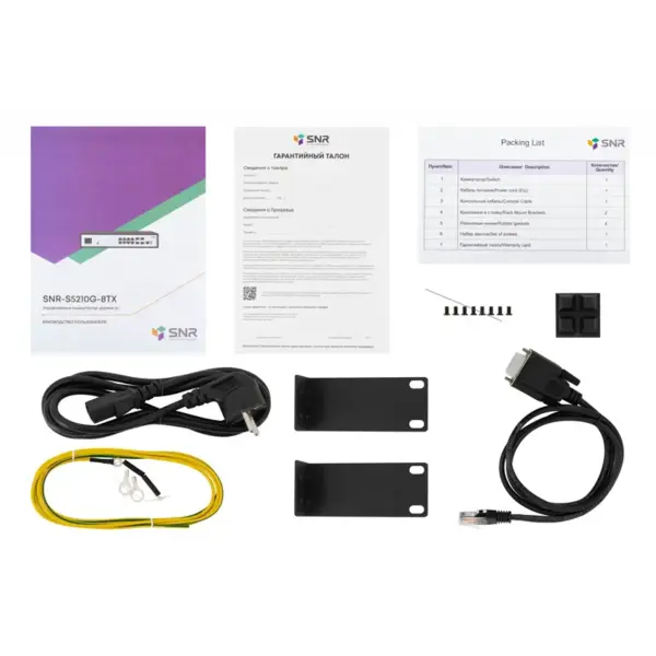 - Коммутатор; Кабель питания; Консольный кабель; Кабель заземления; Крепления в стойку (2 шт.); Набор болтов; Гарантийный талон.