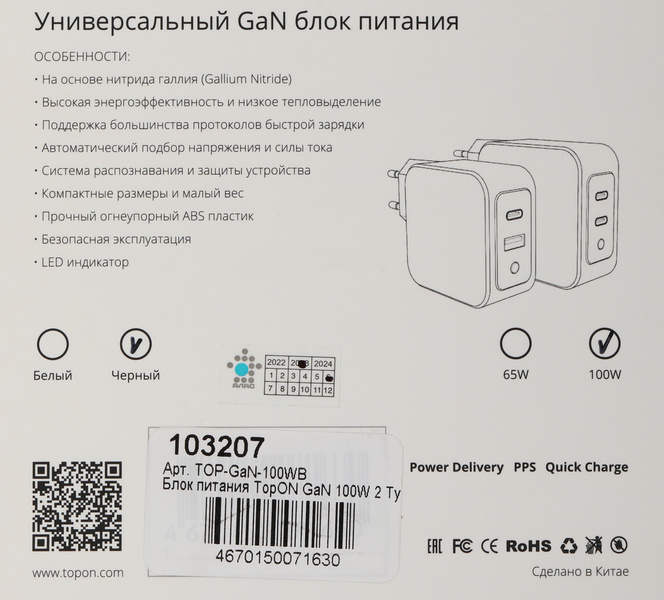 - - На основе нитрида галлия (Gallium Nitride, GaN) - Высокая энергоэффективность и низкое тепловыделение - Автоматический подбор напряжения и силы тока - Система распознавания и защиты устройства - Поддержка Power Delivery 3.1, PPS и QC 4.0