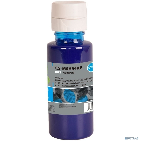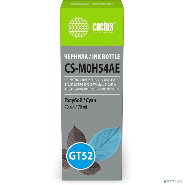 Чернила Чернила Cactus CS-M0H54AE GT52 голубой 70мл для HP Ink Tank 110/115/116/118/310/315/316/318/319/515/615;Wireless 410/411/415/416/418/419;GT5810/5820/5812/5822