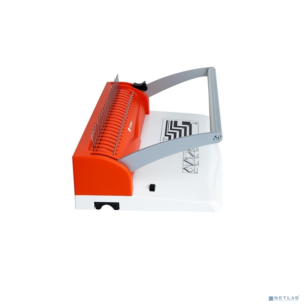- Качественный переплетчик на пластиковую пружину в бело-красном корпусе подходит для использования дома, а также в малом и среднем офисе.