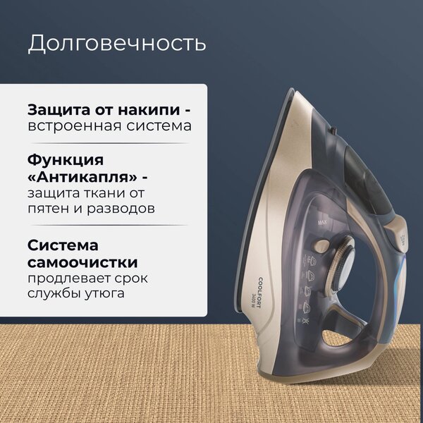 Утюг Coolfort CF-3410 3400Вт сиреневый/золотистый купить в интернет-магазине TPShop.Ru. Наличный и безналичный расчет, розничные и оптовые продажи. Самовывоз, доставка по Москве и МО, отправка во все регионы России.