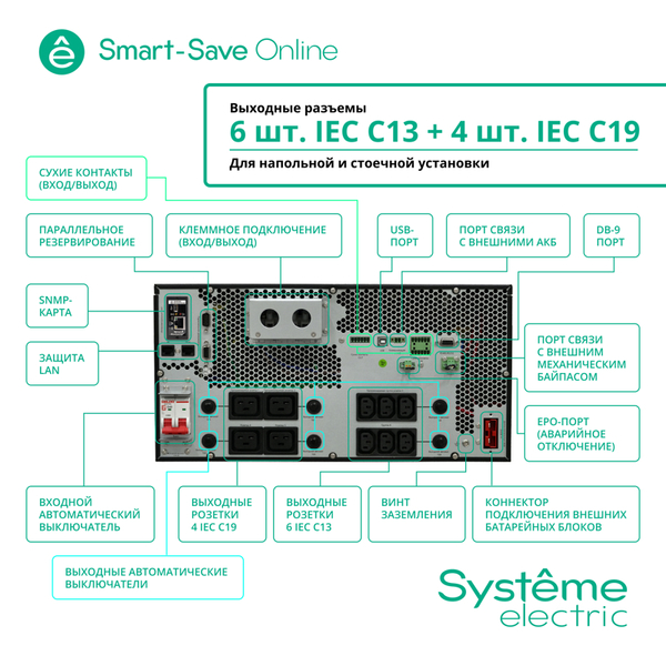 ИБП Systeme Electric Smart-Save Online SRT, 6000VA/6000W, On-Line, Extended-run, Rack 2U+3U(Tower convertible), LCD, 6xC13, 4xC19, SNMP Intelligent Slot, USB, RS-232, Pre-Inst. Web/SNMP купить в интернет-магазине TPShop.Ru. Наличный и безналичный расчет, розничные и оптовые продажи. Самовывоз, доставка по Москве и МО, отправка во все регионы России.