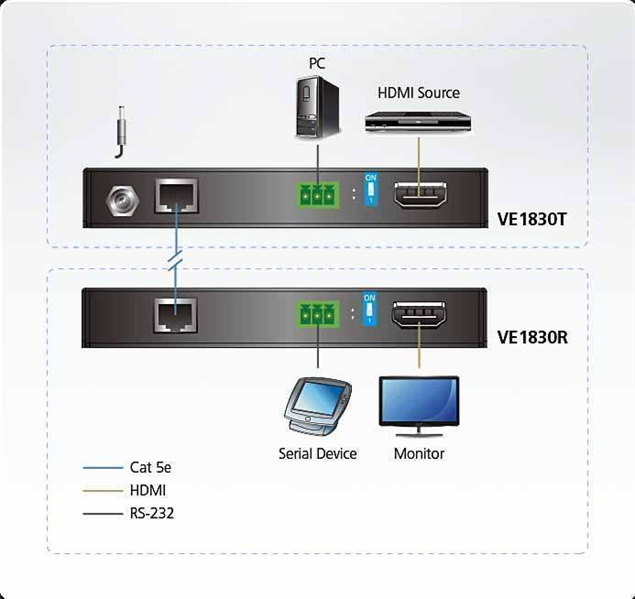 - HDMI-удлинитель VE1830 True 4K с поддержкой HDBaseT-Lite, благодаря входящим в комплект поставки высококачественным передатчику VE1830T и приемнику VE1830R, обеспечивает большую гибкость при профессиональной установке аудио/видео оборудования. Наличие технологии HDBaseT позволяет VE1830 с помощью одного кабеля Cat 5e/6 передавать True 4K HDMI-сигналы на расстояние до 35 м. Данный HDMI-удлинитель поддерживает HDCP 2.2 и соответствует спецификациям HDMI 2.0a (3D, Deep Color, 4k) гарантируя высокое качество видео и изображения без потерь в визуализации. Кроме того, в нем реализована функция PoC (Power over Cable, питание по передающему кабелю), позволяющая запитать приемное устройство от передатчика с помощью источника питания. HDMI-удлинитель VE1830 является простым в использовании и экономичным решением для профессиональных установок аудио-видео оборудования, в которых необходимо превосходное качество HDMI-изображения, таких как учебные классы с использованием цифровых технологий, помещения для видеоконференци