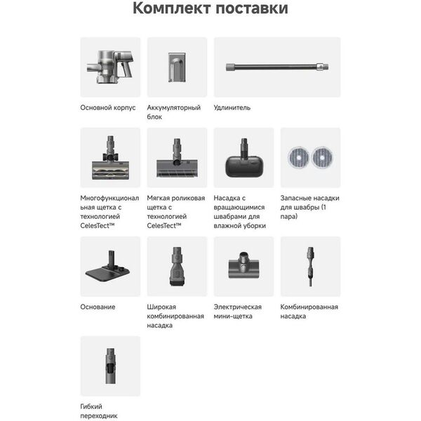 - Пылесос, блок питания, гибкий адаптер-переходник, документация, комплект насадок, моп х 4 шт, напольная станция