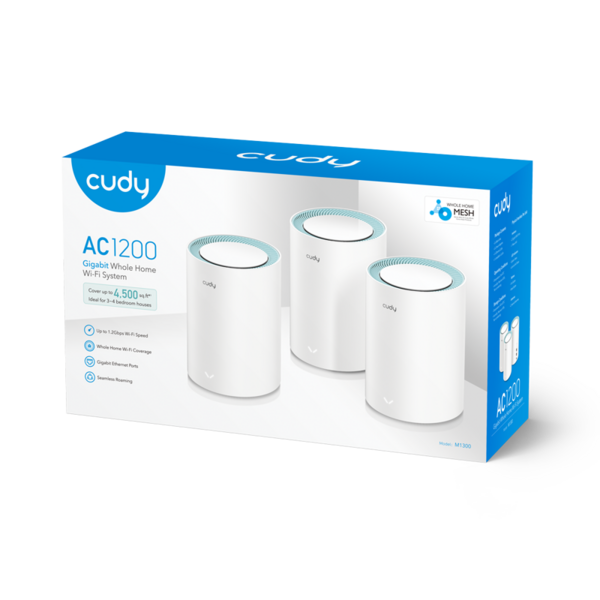 AC1200 Wi-Fi Gigabit Mesh Solution 3-Pack, Chipset MT7621DA+MT7613B+MT7603, Dual-Band, 867Mbps at 5GHz + 300Mbps at 2.4GHz, 802.11ac/a/b/g/n, 2 Gigabit Ethernet Ports, 4 internal antennas, MU-MIMO, DDNS, Zerotier/Wireguard/OpenVPN/IPSec/L2TP/PPTP VPN, DNS over Cloudflare/Google/Quad9, IPv6, Seamless Roaming, TR069/TR098/TR111/TR181, Cudy Mesh, Cudy APP