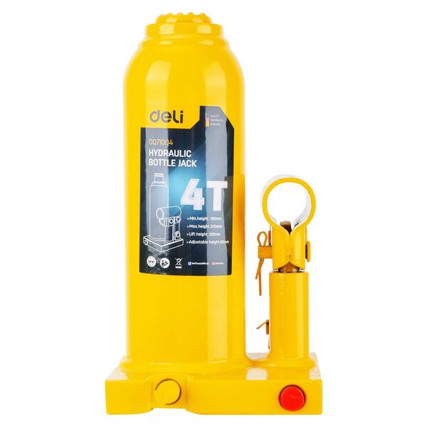 Домкрат бутылочный гидравлический Deli DQ71004 макс.грузоподъемность 4 т, высота подхвата 190мм, высота подъема 370мм, рабочий ход 120мм, ход выдвижного винта 60мм купить в интернет-магазине TPShop.Ru. Наличный и безналичный расчет, розничные и оптовые продажи. Самовывоз, доставка по Москве и МО, отправка во все регионы России.