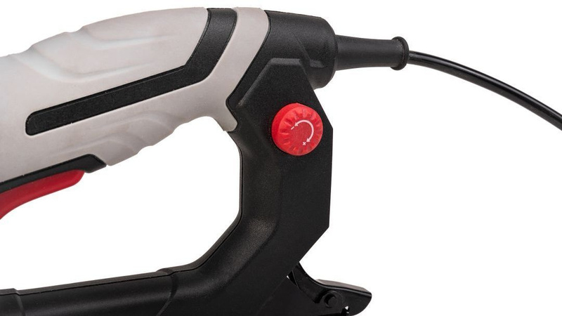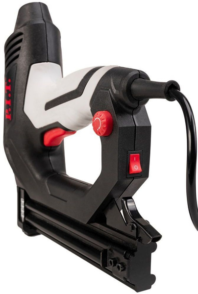 - Конструкция модели позволяет использовать как скобы, так и гвозди. Имеется регулировка силы удара, что позволяет оптимально настроить инструмент под работу с определенным материалом. Скорость забивания составляет 20 шт/мин, вместительность магазина 100 шт.