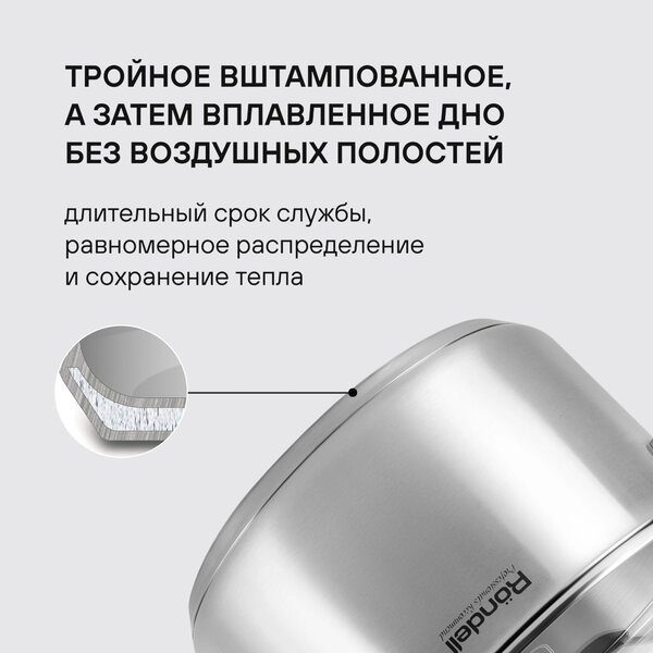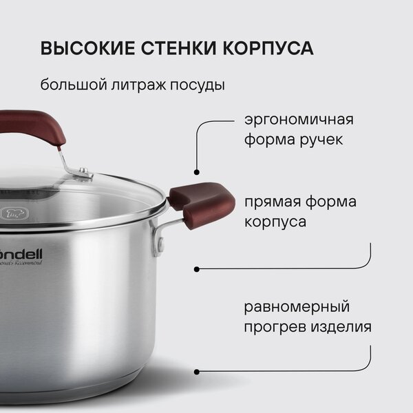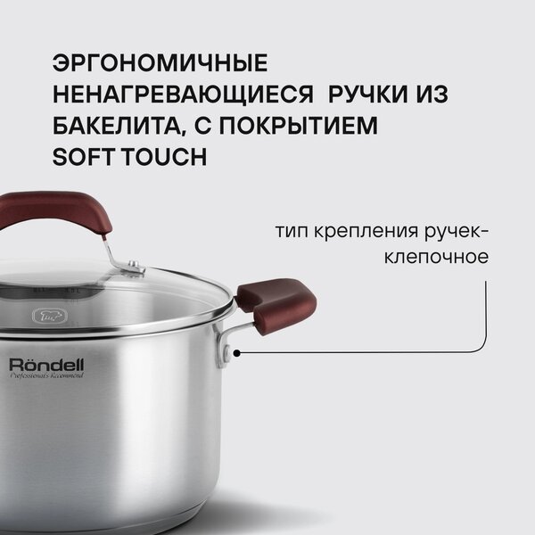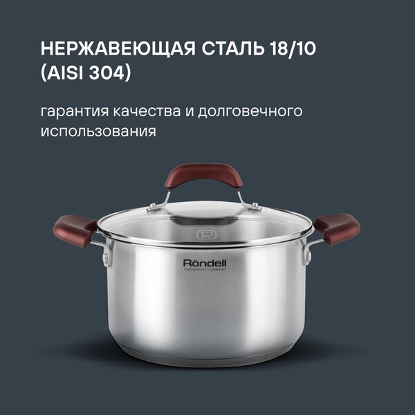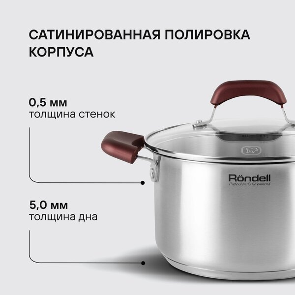 - Материал: высококачественная нержавеющая сталь 18/10. Внутреннее покрытие: без покрытия. Толщина стенок: 0,5 мм. Толщина дна: 5,0 мм. Материал крышки: термостойкое стекло. Аксессуары: из бакелита, с покрытием Soft Touch. Преимущества: высокие стенки корпуса – большой литраж посуды.