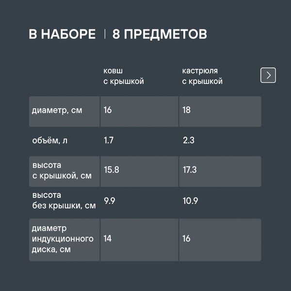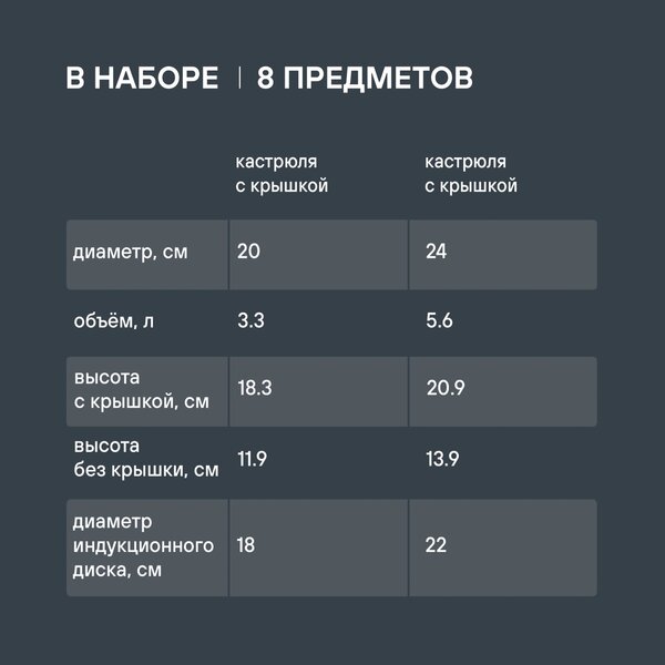 - Три кастрюли 18 см (2,3 л), 20 см (3,3 л), 24 см (5,6 л), ковш 16 см (1,7 л), со стеклянными крышками