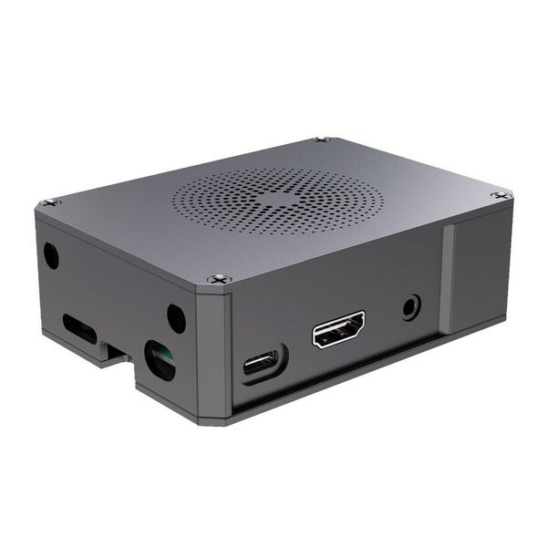 - Корпус для микрокомпьютера ROCK 5C. Боковое отверстие для кнопки включения. Вентиляционная решетка на верхней панели.
