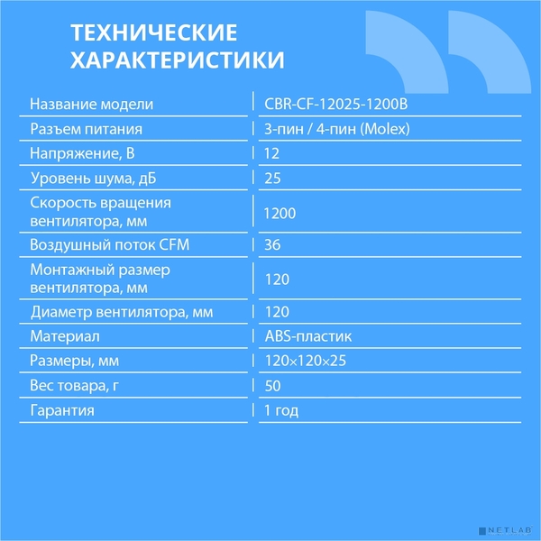 CBR Вентилятор для корпуса CBR-CF-12025-1200B, 120*120*25мм, 3-pin+molex, 1200 RPM, 36 CFM, 25 dBA купить в интернет-магазине TPShop.Ru. Наличный и безналичный расчет, розничные и оптовые продажи. Самовывоз, доставка по Москве и МО, отправка во все регионы России.