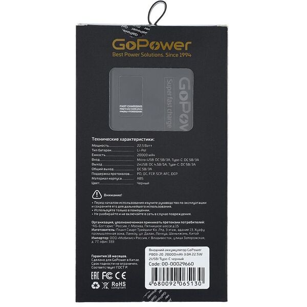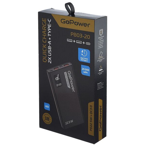 Внешний аккумулятор/ Внешний аккумулятор GoPower PB03-20 20000mAh 3.0A 22.5W 2USB/Type-C черный (1/50) купить в интернет-магазине TPShop.Ru. Наличный и безналичный расчет, розничные и оптовые продажи. Самовывоз, доставка по Москве и МО, отправка во все регионы России.