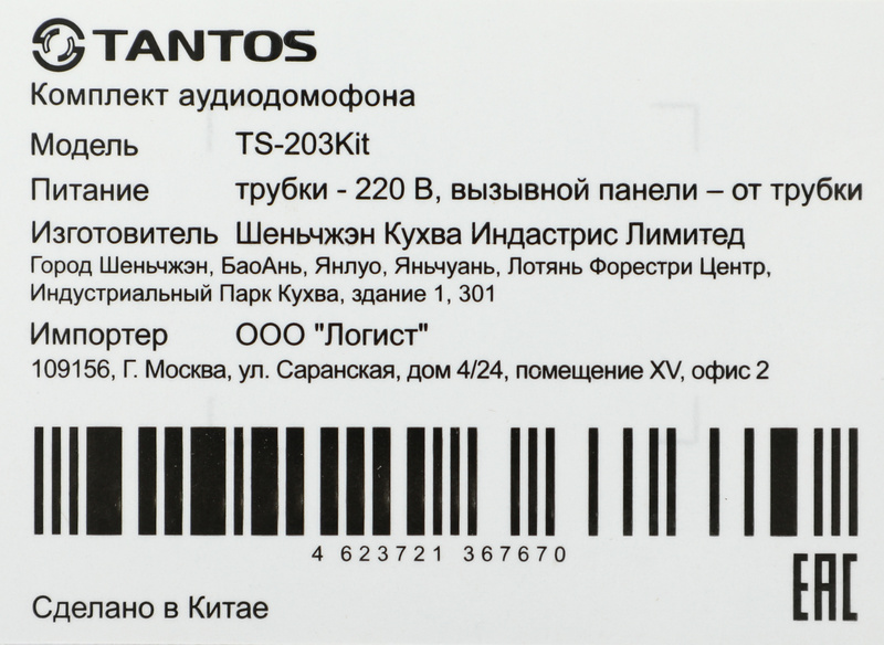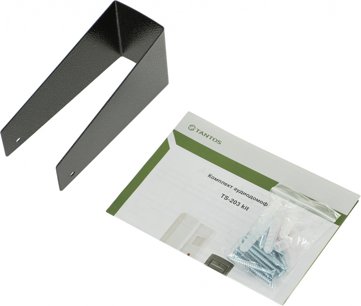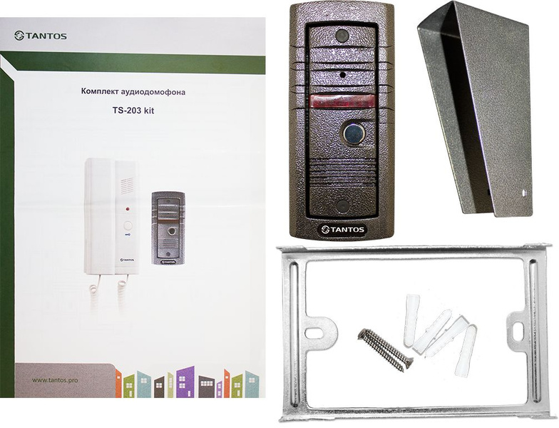 - В комплект входят: вызывная панель с универсальным креплением (врезная обойма и козырек), трубка TS-203HA.