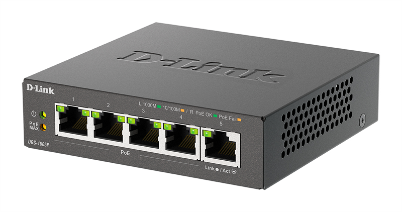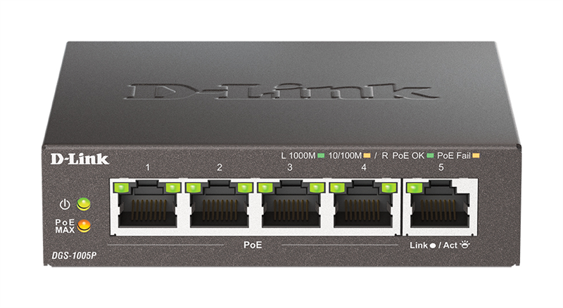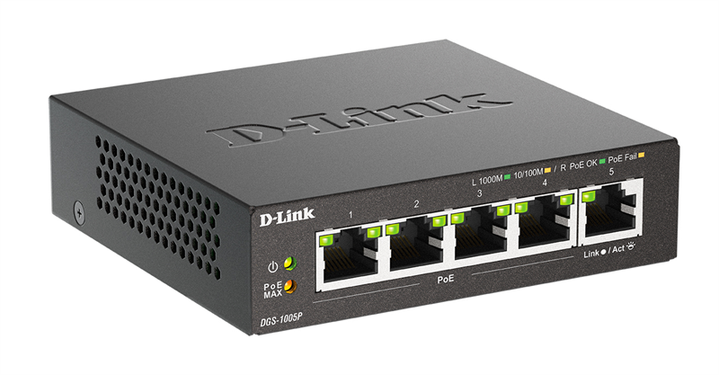 Неуправляемый коммутатор D-Link DGS-1005P/B3A Неуправляемый коммутатор с 5 портами 10/100/1000Base-T (4 порта PoE 802.3af/at, PoE-бюджет 60 Вт)
