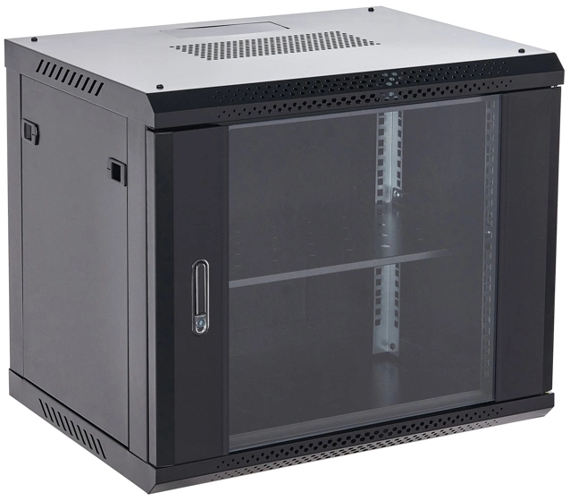 Настенный шкаф Rexant RAL 9005 19" 9U 600×450×501 (ШxГxВ), дверь стекло, металлическая задняя стенка, боковые съемные стенки