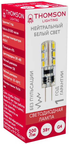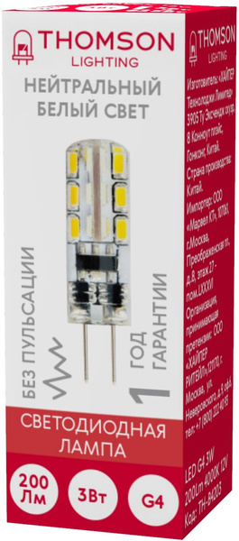 Лампа светодиодная Thomson TH-B4203 3Вт цок.:G4 капсул. 12B 4000K св.свеч.бел.нейт. (упак.:1шт) купить в интернет-магазине TPShop.Ru. Наличный и безналичный расчет, розничные и оптовые продажи. Самовывоз, доставка по Москве и МО, отправка во все регионы России.