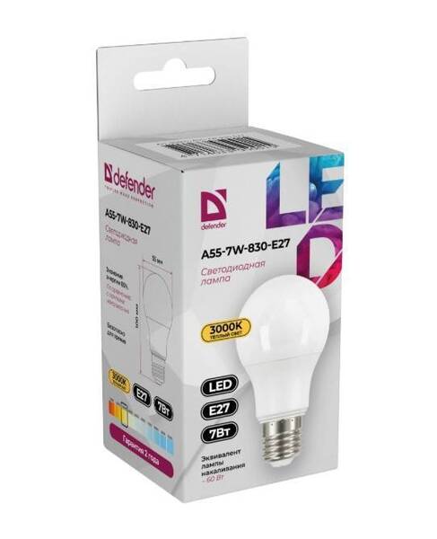 Defender Лампочка светодиодная A55-7W-830-E27 груша, 3000 К, теплый белый, 1 шт.