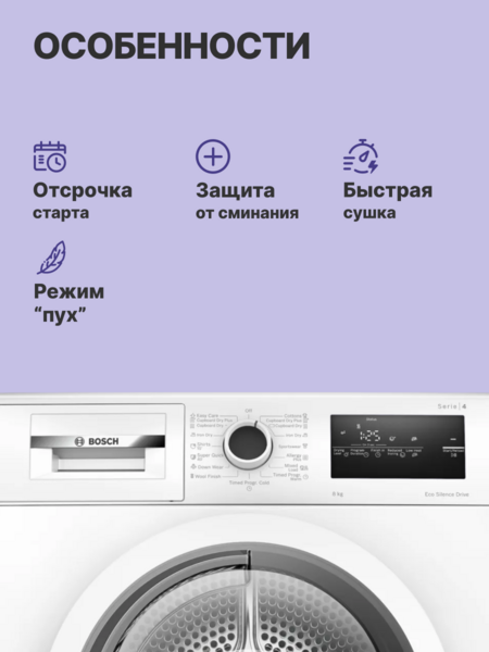 84.2х59.8х61.3 см, Serie 4, конденсационный сушильный барабан, 8кг, белый цвет,QuickDry Auto program,AutoDry,EcoSilence™ Motor