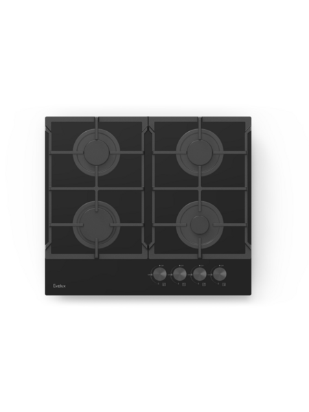 Варочная панель Газовая варочная панель EVELUX, Hi-Tech, 60 см, 4 конфорки, чугунные решетки, газ-контроль, электроподжиг, механическое управление, поверхность из закаленного стекла, цвет черный