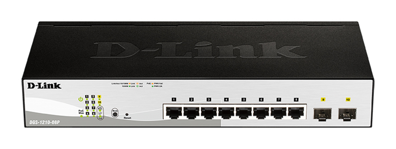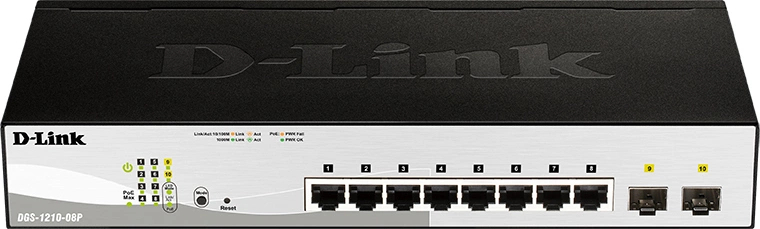 D-Link DSS-200G-10MP / A1A Настраиваемый L2 коммутатор с 8 портами 10 / 100 / 1000Base-T и 2 портами 1000Base-X SFP (8 портов PoE 802.3af / at, PoE-бюджет 130 Вт, дальность до 250 м)