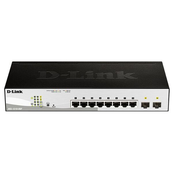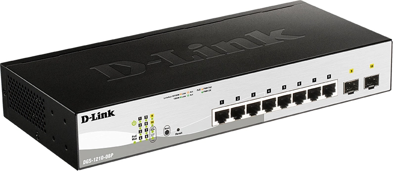 Управляемый коммутатор для рабочих групп Коммутатор D-Link DGS-1210-08P/G3A Настраиваемый L2 коммутатор с 8 портами 10/100/1000Base-T и 2 портами 1000Base-X SFP (8 портов PoE 802.3af/at, PoE-бюджет 65 Вт)