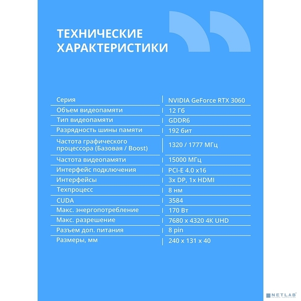 Видеокарта CBR RTX3060 12Gb GDDR6, 192bit, 1320-1777Mhz, 3*DP + 1*HDMI 2.1, 170W, Ret [VGA-STX3060-12G-RTL] купить в интернет-магазине TPShop.Ru. Наличный и безналичный расчет, розничные и оптовые продажи. Самовывоз, доставка по Москве и МО, отправка во все регионы России.