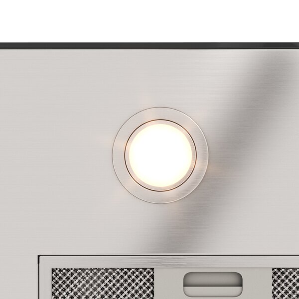 - Панель управления с сенсорами расположена по центру фронтальной плоскости. Дизайн вытяжки кажется универсальным, ведь ее можно установить в большинство современных интерьеров. Для поверхностей из полированной нержавеющей стали используется специальная технология обработки scotch – bright.