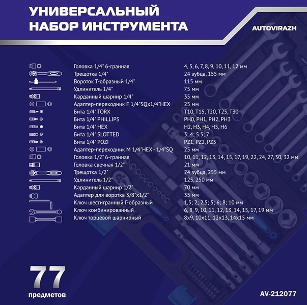 - Набор инструмента (77 предметов, 1/2 1/4 DR, CrV) AUTOVIRAZH AV-212077 используется во время проведения ремонтных или слесарно-монтажных работ.