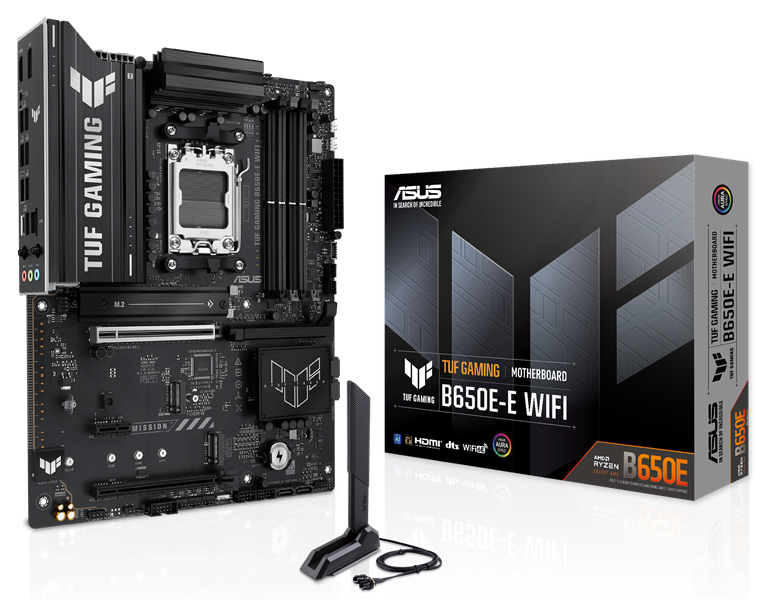 - ASUS TUF GAMING B650E-E WIFI, AM5, B650, 4*DDR5, 4*SATA, 3*M.2, 4*USB 3.2, 3*USB 2.0, Type-C, 3*PCIx16, 1*PCIx1, DP+HDMI, ATX; 90MB1LT0-M0EAY0