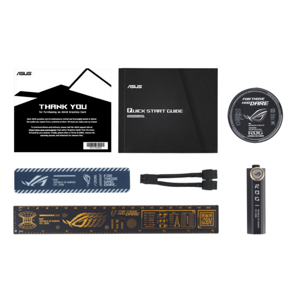 - Видеокарта, документация, кабель-переходник питания, держатель видеокарты (опция), стикеры (опция), брелок (опция), линейка (опция)