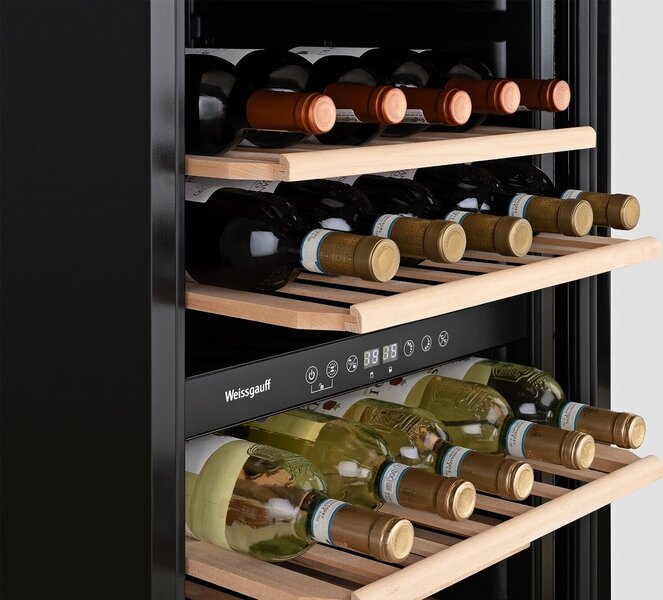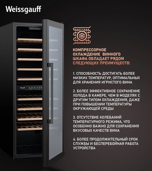Винный шкаф Weissgauff WWC-77 DB DualZone 1-нокамерн. черный купить в интернет-магазине TPShop.Ru. Наличный и безналичный расчет, розничные и оптовые продажи. Самовывоз, доставка по Москве и МО, отправка во все регионы России.