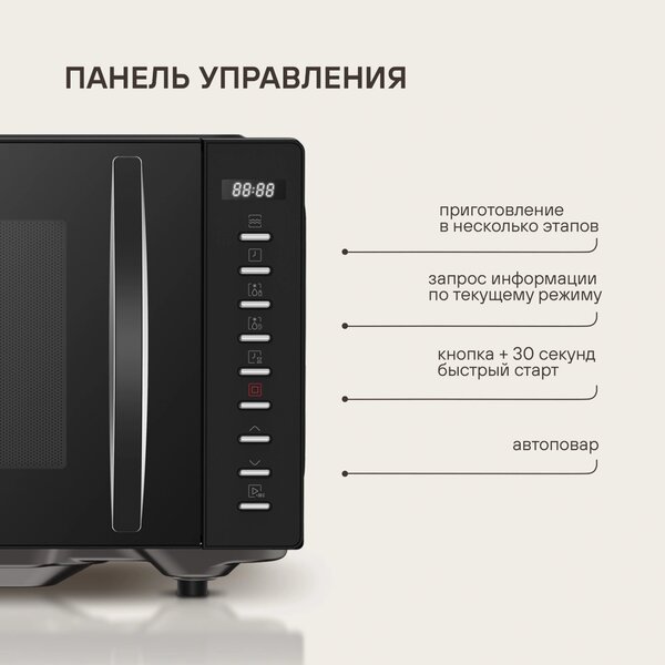 - быстрый старт, звуковой сигнал окончания приготовления, кнопка +30 секунд, пауза, регулировка мощности