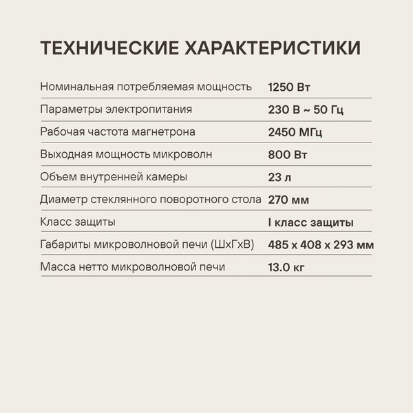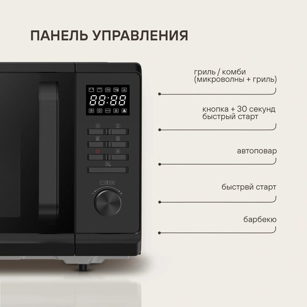 - быстрый старт, звуковой сигнал окончания приготовления, кнопка +30 секунд, пауза, регулировка мощности
