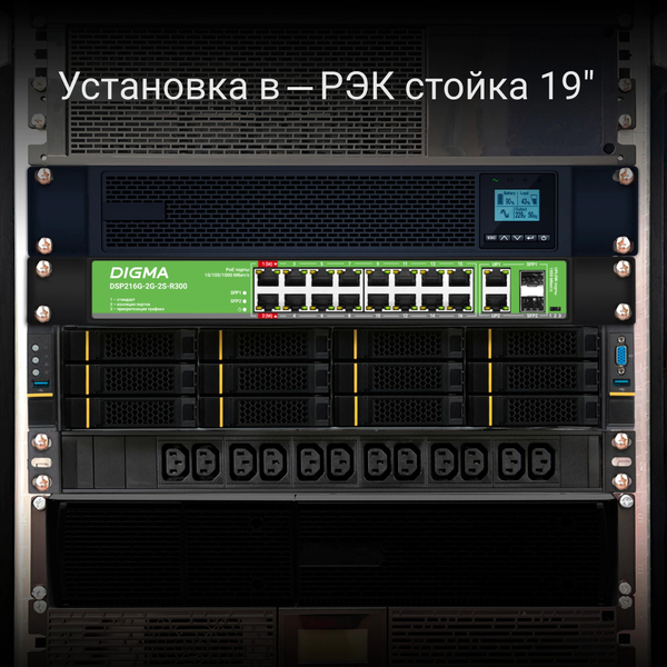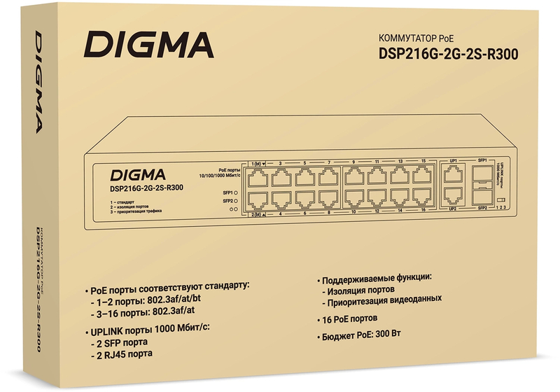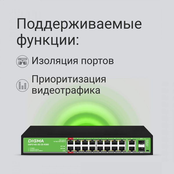 Неуправляемый коммутатор Коммутатор Digma DSP216G-2G-2S-R300 (L2) 18x1Гбит/с 2SFP 16PoE 16PoE+ 2PoE++ 300W неуправляемый купить в интернет-магазине TPShop.Ru. Наличный и безналичный расчет, розничные и оптовые продажи. Самовывоз, доставка по Москве и МО, отправка во все регионы России.