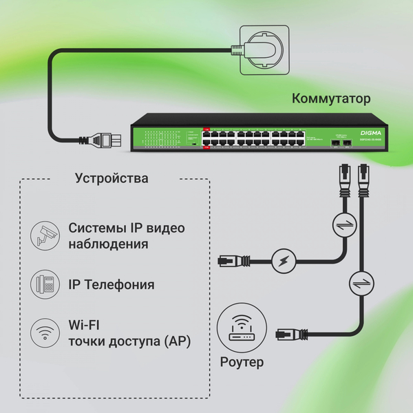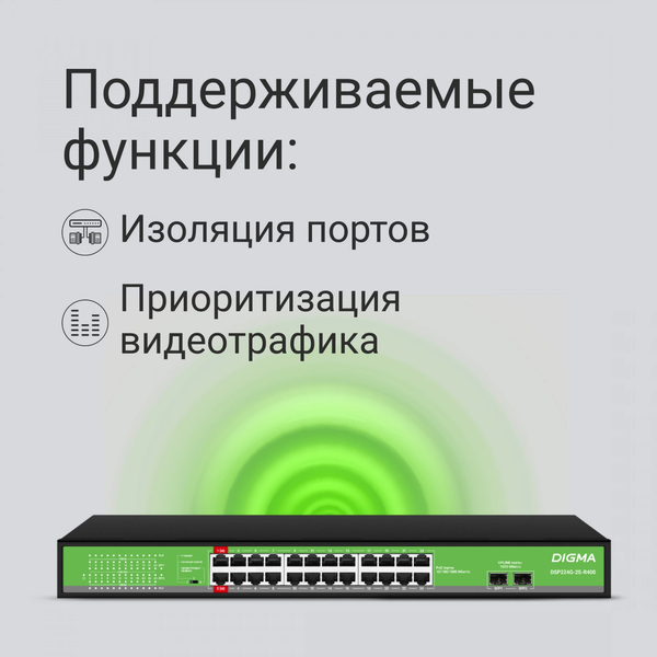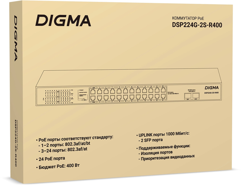Неуправляемый коммутатор Коммутатор Digma DSP224G-2S-R400 (L2) 24x1Гбит/с 2SFP 24PoE 24PoE+ 2PoE++ 400W неуправляемый купить в интернет-магазине TPShop.Ru. Наличный и безналичный расчет, розничные и оптовые продажи. Самовывоз, доставка по Москве и МО, отправка во все регионы России.