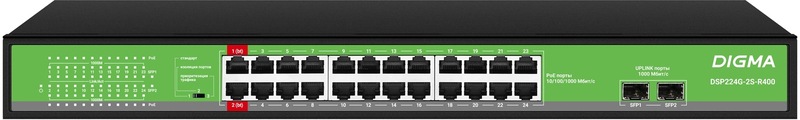 Неуправляемый коммутатор Коммутатор Digma DSP224G-2S-R400 (L2) 24x1Гбит/с 2SFP 24PoE 24PoE+ 2PoE++ 400W неуправляемый