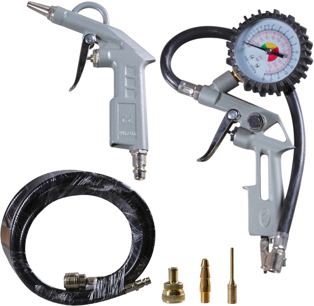 - Безмасляный коаксиальный компрессор, пневмопистолет для продувки, пневмопистолет с манометром для накачки, набор насадок для накачки (3 штуки), воздушный шланг 5 м.