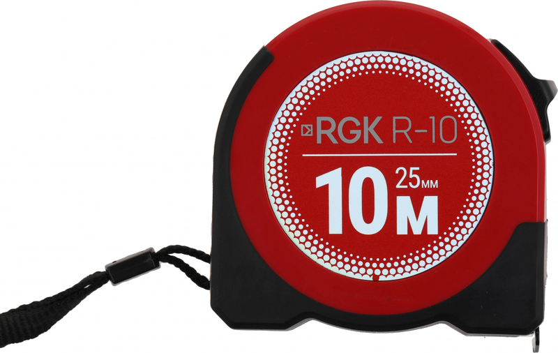 - Измерительная рулетка RGK R-10 со стальной лентой длиной 10 метров выполнена в компактном ударопрочном корпусе и имеет клипсу для крепления на поясе. Небольшие размеры позволяют хранить рулетку в ящике с инструментами. Материал ленты: сталь+нейлон. Резиновые накладки на корпусе.