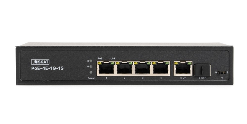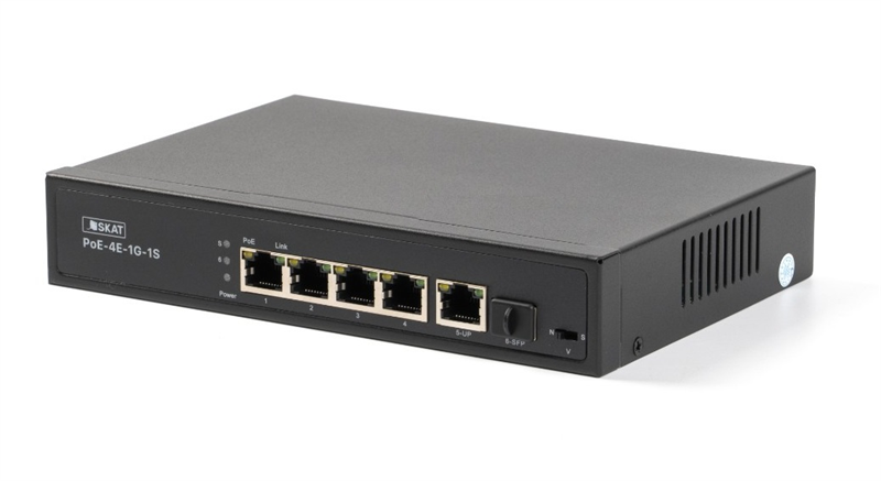 - (4084) SKAT PoE-4E-1G-1S коммутатор PoE Plus, мощность 80Вт, порты: 4-Ethernet, 1-Uplink, 1-SFP